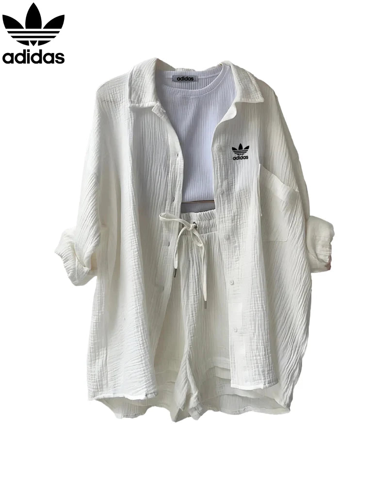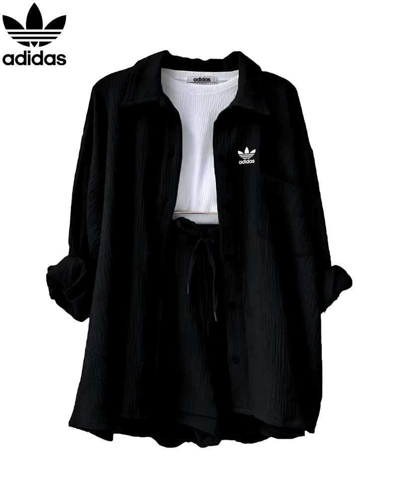 Designed for casual days and effortless coordination, this 2-piece set features a relaxed button-down shirt paired with drawstring high-waisted shorts—perfect for lounging, light outings, or vacation-ready styling.